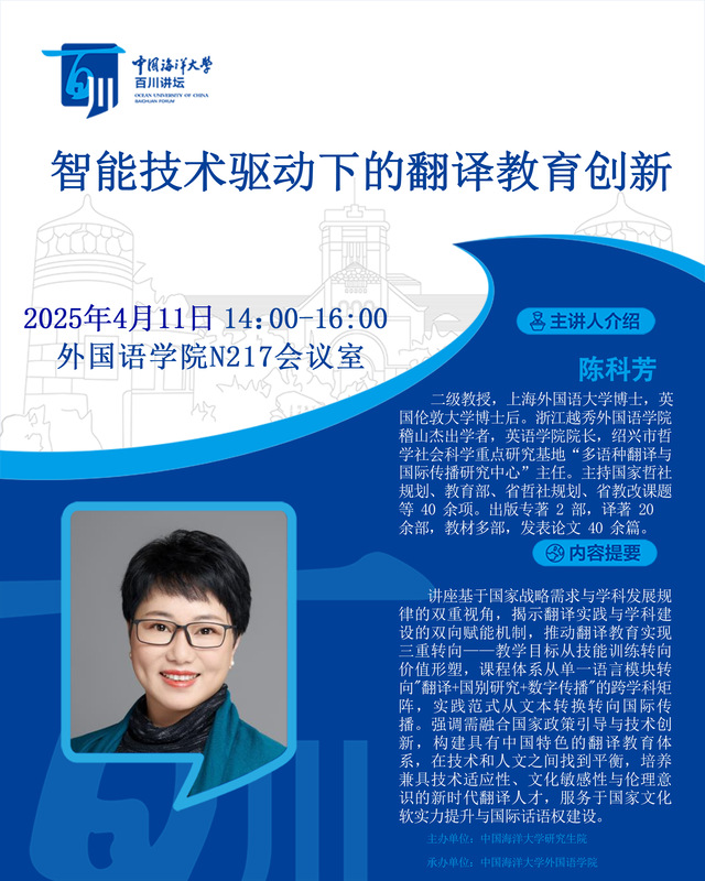 研究生百川讲坛 | 第447讲 陈科芳:智能技术驱动下的翻译教育创新