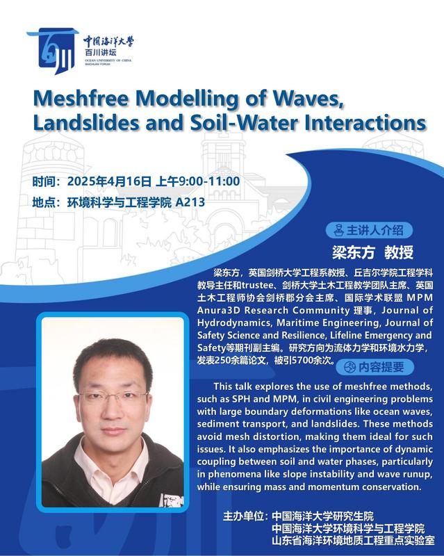 研究生百川讲坛 | 第452讲 梁东方:波浪、滑坡和水-土相互作用的无网格建模