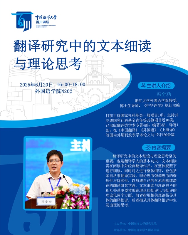 研究生百川讲坛 | 第497讲 冯全功:翻译研究中的文本细读与理论思考