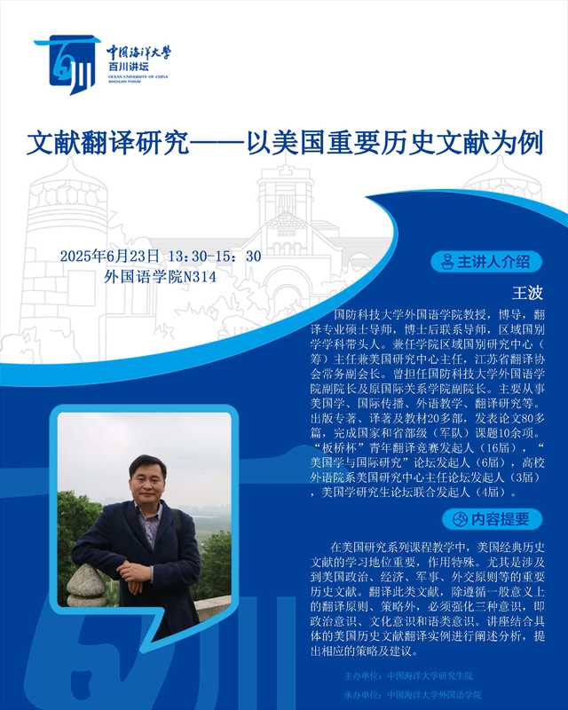 研究生百川讲坛 | 第500讲 王波:文献翻译研究——以美国重要历史文献为例