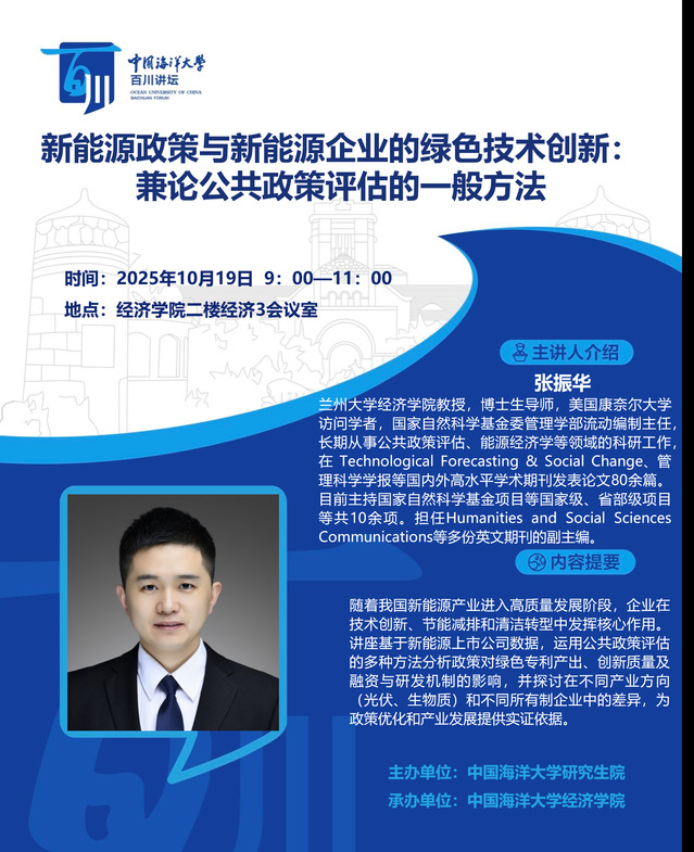研究生百川讲坛 | 第534讲 张振华:新能源政策与新能源企业的绿色技术创新:兼论公共政策评估的一般方法