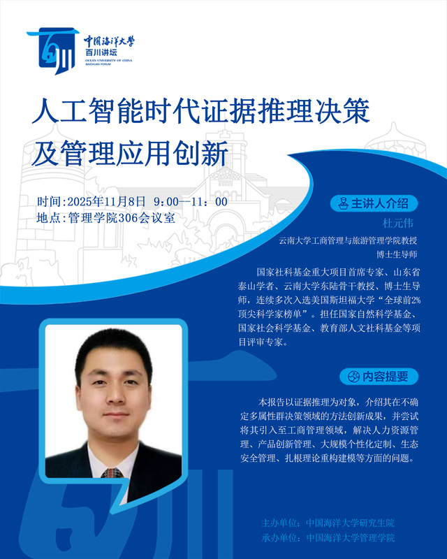 研究生百川讲坛 | 第556讲 杜元伟:人工智能时代证据推理决策及管理应用创新