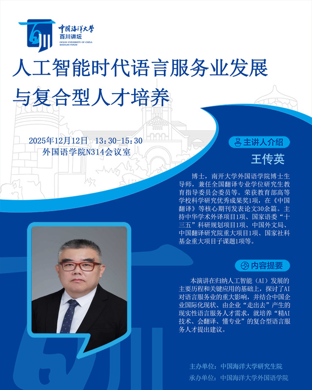 研究生百川讲坛 | 第583讲 王传英:人工智能时代语言服务业发展与复合型人才培养