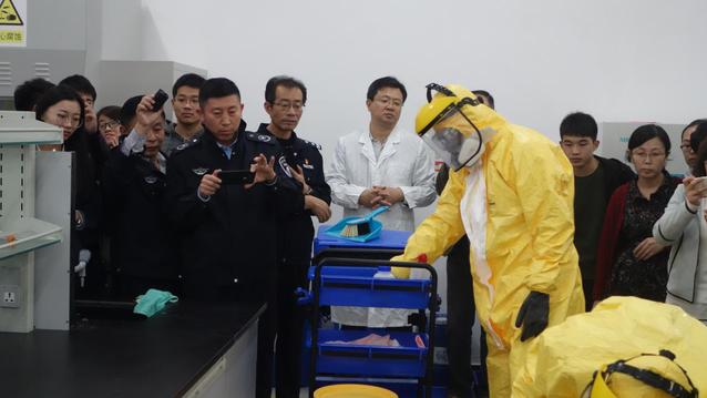 为进一步提升我校实验室安全管理水平,提高广大师生的安全意识,增强防范与处置实验室突发环境事件能力,10月26日下午,国有资产与实验室管理处在我校鱼山校区举办了实验室突发环境事件应急演练,食品科学与工程学院、水产学院、海洋生命学院、医药学院等60余名师生参加了此次活动,青岛市环境保护局市南分局、青岛市公安局市南分局有关领导和专家到场观摩并进行了现场指导。
