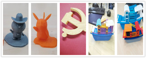 为了更好地学习3D打印技术,同学们三两一组一台机器,开始自主探索打印机的工作原理和各个部件的工作方法。理论知识掌握完备后,大家开始分组学习打印机的使用并且合作完成红船的打印以及个人作品的打印。