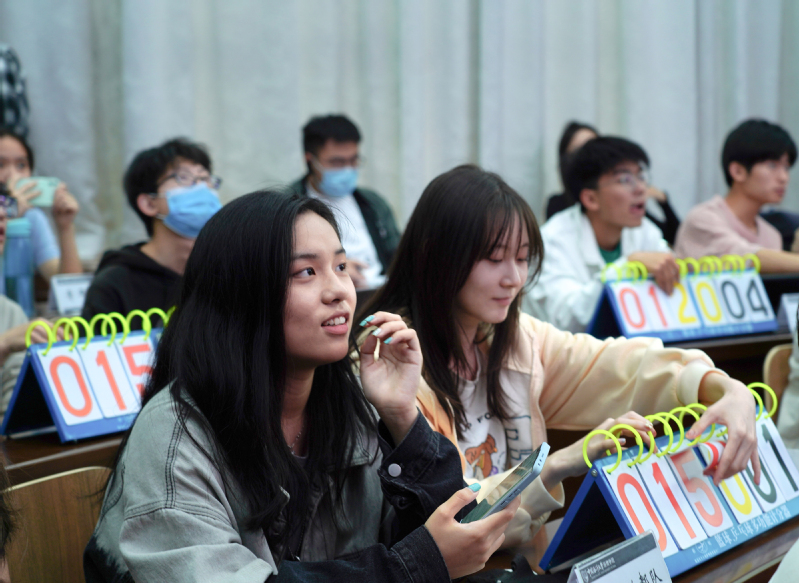 “合力攻坚”环节,各团队需在规定的时间内轮流作答,由各队工作人员计时。每位参赛选手都全神贯注,以最快的速度回答出大屏幕上的题目,每个小组齐心协力,合作答题,大家优异的表现赢得了在场同学阵阵热烈的掌声。