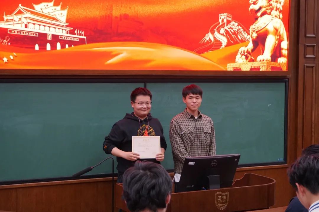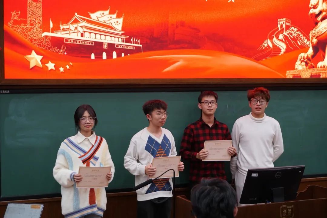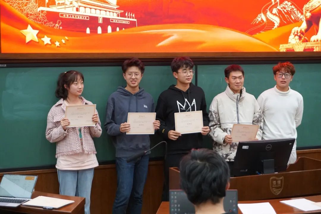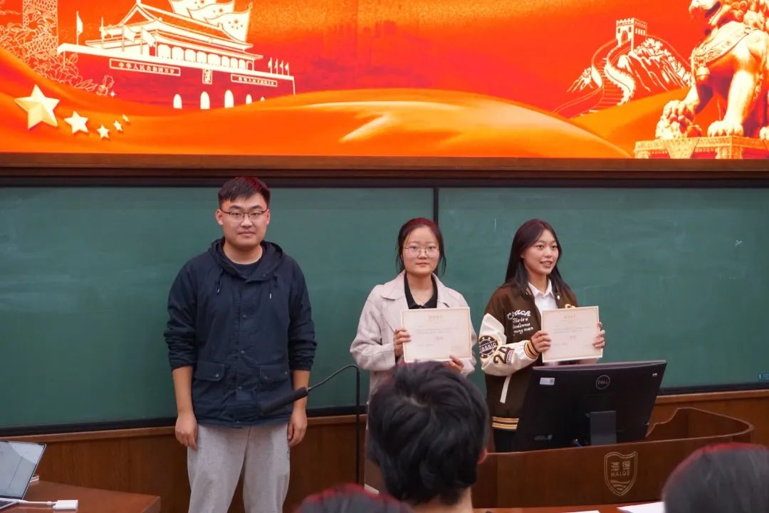 经过各位评委老师、同学的评选,最终决出获奖者,由朱鑫磊、焦佳奇和入党积极分子培训班班长马言宇同学为各位获奖同学颁奖。