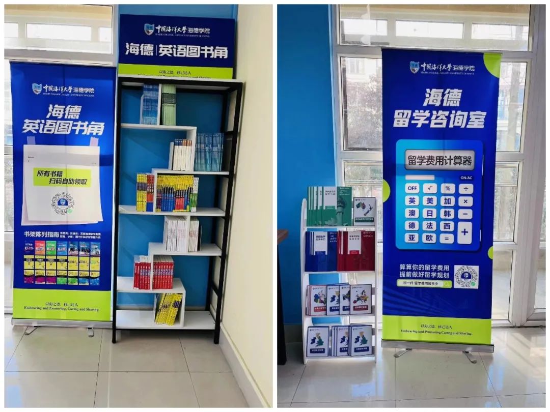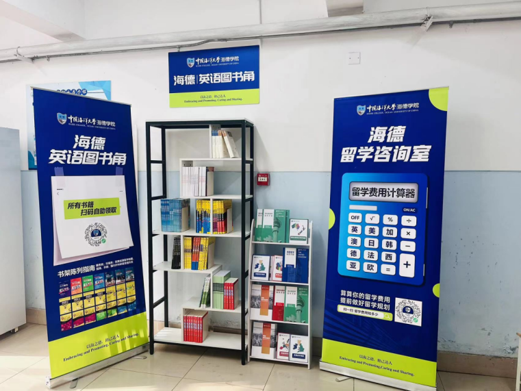 英语图书角提供澳洲、加拿大、英国、亚洲、欧洲留学服务手册以及留学地图,方便同学们更详细深入地了解不同国家的留学政策。图书角还提供雅思类、托福类等英语学习资料。书架旁边设置有相关二维码,同学们可以扫码从线上查阅有关英语和留学的书籍,也可以通过“留学计算器”享受个性化的留学计划并计算出自己所需的留学费用,帮助我们提前做好留学规划。