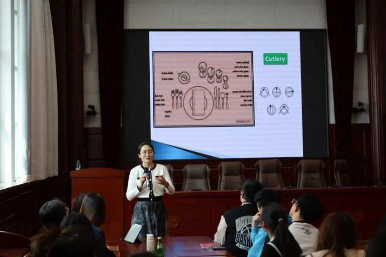 随后,陈胜男以风趣幽默的语言,结合海德学子的实际特点,图文并茂、深入浅出地讲述了涉外礼仪的方方面面。跟随陈胜男的讲解,同学们对于西方文化有了更为深入的认识,了解了诸如入关、租车、乘坐公共交通、宴会、送礼的艺术与禁忌等相关礼仪常识,为未来出国学习、跨文化交际做好准备。
