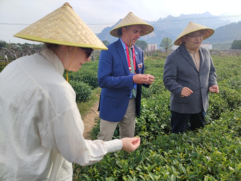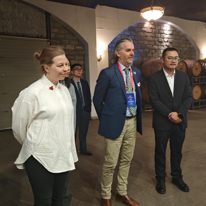 10月25日,Jason Able教授一行先后前往学院学生实习实训基地青岛晓阳春茶园、华东葡萄酿酒有限公司参观,交流和了解茶叶制作工艺、葡萄酒酿造生产等技术,体验了中国茶文化和葡萄酒文化。在茶园中,Jason Able教授深入了解茶叶种植、采摘、加工等流程,并考察中国茶产业的可持续发展现状。在华东葡萄酿酒有限公司,魏帅强董事长介绍了葡萄种植、酿造及储存过程,分享现代葡萄酒生产技术与管理理念,Jason Able教授对中国葡萄酒产业的最新动态有了深入的了解,双方就葡萄栽培和酿造技术上的合作进行了探讨。