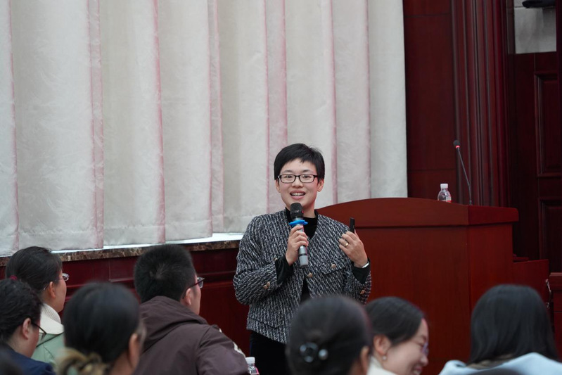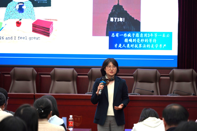 随后,主讲人庄昀筠教授作报告。庄教授从“新、心、行、信、形”五个方面展开,结合自身教学设计案例,生动解析教学创新的方式方法。她指出当下教学面临新学情新问题,教与学不同频导致学生专业认同感低,课堂参与感低,学习获得感低。她表示以学生发展为中心的育人目标更加强调培养学生的终身学习力和全球胜任力。教师要向学生传递与世界相交,与时代相通的理念,要让学生深刻认识到自己的文化根源和世界观,扎根中国、融通中外、面向未来。她强调,教师要开放信息接收渠道,运用多元信息化手段,运用信息追踪循证教学方法,并且重视教学组织形式,教无定法,要根据内容灵活调整课程设计。庄教授提出的五大创新举措——重塑育人目标、改革教学内容、改善教学环境、回归快乐课堂、学情收集反馈,为破解教学困境,实现教学融通提供了系统解决方案。