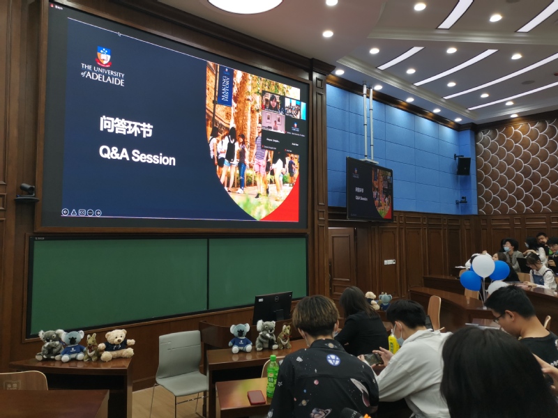 Zhang Han, the admissions manager of the University of Adelaide in China, introduced Australia's epidemic prevention policy and study abroad support, curriculum arrangement and academic support, student support institutions and learning and living services. Then the live broadcast on the campus of the University of Afghanistan was launched. Five student representatives of the University of Afghanistan came to the auditorium, student center, student union building, University Village and other landmark buildings of the University of Afghanistan to lead you to experience the perfect and convenient campus infrastructure. During the lecture, the students learned about the latest entry requirements of Australia and the epidemic prevention and control measures of the University of Afghanistan, and had a more real and intuitive feeling about the employment guidance program, scholarship policy, learning and living environment of the University of Afghanistan. Finally, on-site and online students exchanged views with teachers of Atsu on academic paths, living facilities and other issues.
