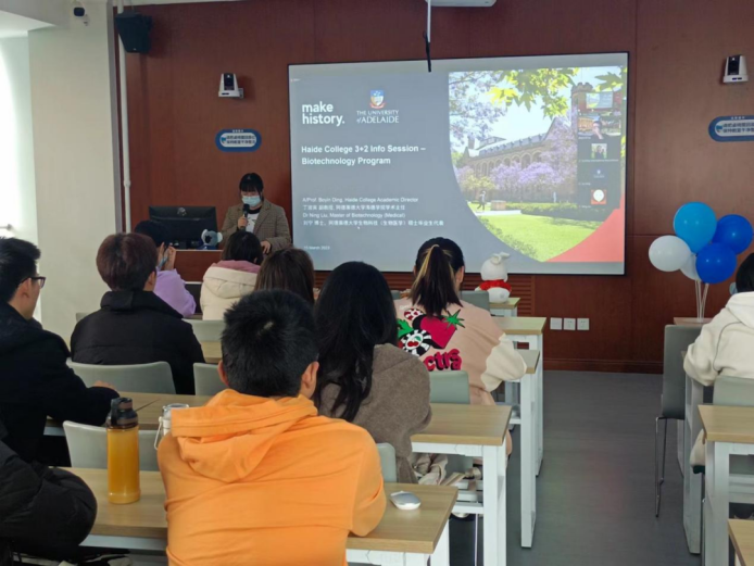 In order to deepen students' understanding of the University of Adelaide and the 3+2 cooperative education program, to help them feel the study, life and cultural environment of the University of Adelaide in a comprehensive way, to understand the career prospects of various majors, to plan the direction and guide the students' future study trips in Australia, HaideCollege invited Associate Professor Boyin Ding, Academic Director of HaideCollege of the University of Adelaide, and outstanding graduate representatives of the University of Adelaide, to hold a 3+2 program for students majoring in mathematics and applied mathematics, biotechnology and food Science and engineering. The event was hosted by Chunning Guo, Student Affairs Secretary of HaideCollege.