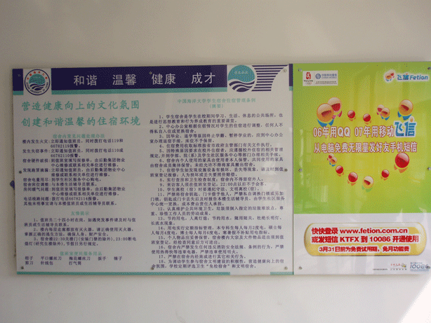 为进一步加强学生宿舍楼文化氛围,继鱼山校区和浮山校区之后,近日崂山校区宿舍楼内也全部更换了以“和谐、温馨、健康、成才”为题头的宣传栏。此次的更换也标志着三校区达到统一。