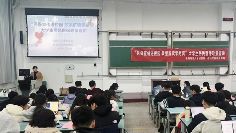 本站讯 为落实青岛市医疗保障局《关于开展医保政策进高校活动的通知》要求,进一步推进大学生居民医疗保险参保缴费工作,11月14日,校医院联合崂山区医疗保障局在崂山校区举办了“医保宣讲进校园 政策解读零距离”大学生居民医保政策宣讲活动。