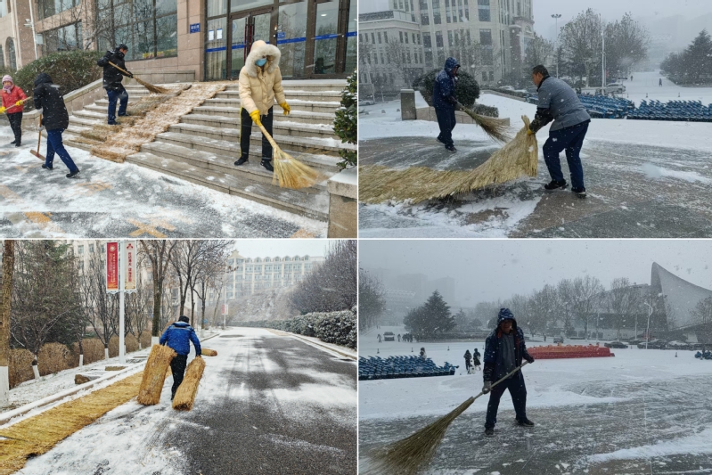 中心发动全体人员手持扫帚、推雪板等工具,划分责任区域开展清扫、运送积雪、铺设防滑草垫等除雪工作。在工作人员的共同努力下,校园主干道、教学楼及宿舍出入口等关键区域的积雪很快被清除,为师生开辟出一条条安全通道。尽管寒风凛冽,但大家的工作热情丝毫未减。物业服务人员王师傅:“下雪天路滑,路上的积雪打扫干净了,老师和同学们在校园里的通行才有保障。”