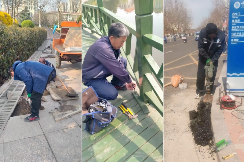 做好场地设施维护,雕琢每个幸福角落。后勤对樱花大道、图书馆广场、凯旋广场等重点区域开展“绣花式”巡检维护,修补路面20余平方米,更换及修复石板50余块,加固映月湖步行道围栏等,确保每个打卡点都以完美姿态迎接新人。