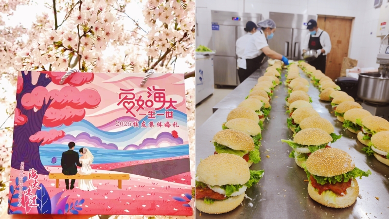 美食交响情满舌尖,烙印海大幸福年轮。为保障婚礼当天500余份套餐和100余份工作餐供应,后勤严选优质食材供应商,从原料采购、加工制作到运输配送层层核验,加大食品安全巡检力度,确保“舌尖上的安全”。特别设计的“爱如海大 一生一世”定制纸质手提袋,为参加仪式的校友新人留下海大味道的专属记忆。
