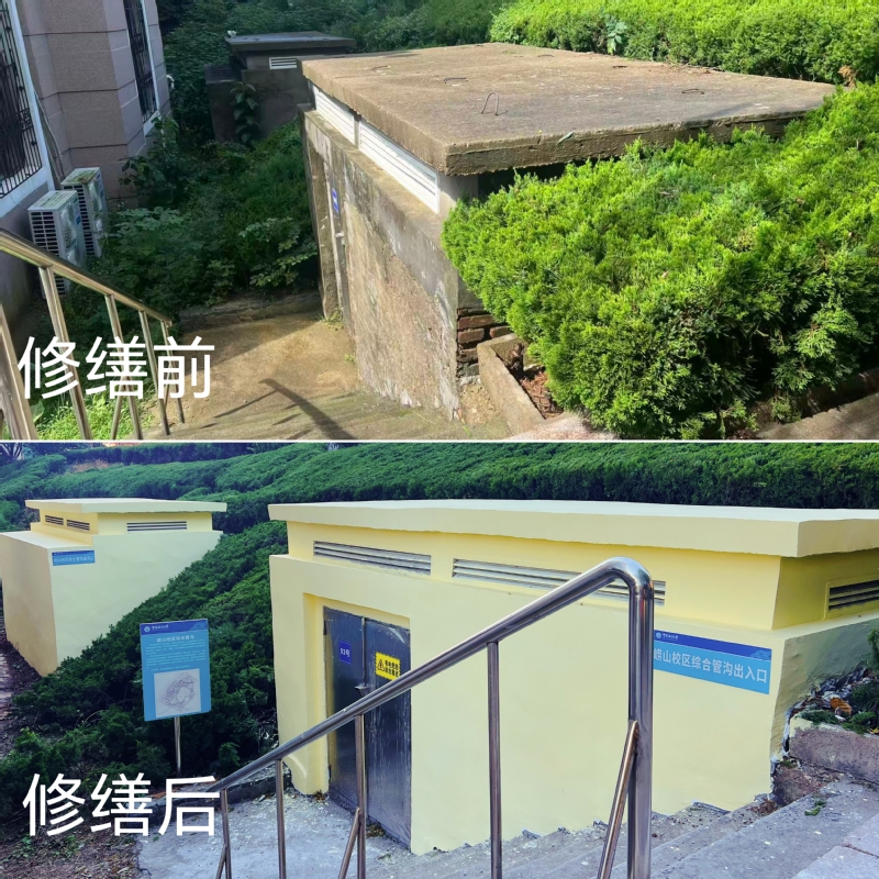 综合管沟是校园各类管线的“主动脉”,其结构安全至关重要。中心前期组织专业人员开展专项安全评估,针对部分管沟外立面饰面老化、局部破损等问题实施集中修缮。施工中,中心严格把控材料与工艺,对破损风化部位修复加固,同步完成外立面清洁防护,并张贴方向指引、管线类型等标识牌。此举不仅消除了结构安全隐患,保障了管沟耐久性,也为日常巡检、应急抢修提供了清晰的行动指引。