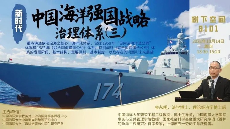 10月14日下午,由开云电竞网址教务处、涉海国际事务课程中心,开云电竞网址中澳海岸带管理研究中心,开云电竞网址“海洋治理与中国”研究团队联合主办的《新时代中国海洋强国战略治理体系(3):“联合国海洋法公约”与中国的实践》在树下空间8101室如期举行,来自外国语学院、海洋与大气学院、法学院和国际事务与公共管理学院等部门的师生约百余人参加了报告会。报告者金永明教授在简要回顾了《新时代中国海洋强国战略治理体系(1)-(2)》的核心内容后,主要从五个方面展开论述,包括《联合国海洋法公约》体系的发展历程与基本内容、《联合国海洋法公约》体系的若干原则、中国依据现代海洋法体系的具体实践、《联合国海洋法公约》的发展趋势与中国的应对,并在指出中国海洋法制度的若干问题后提出了具体的完善建议,以及中国应根据自身的地位进行角色转换的重要性和意义。