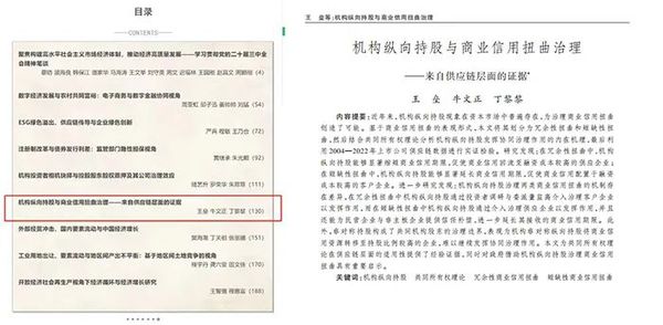 近日,海洋发展研究院王垒教授(第一作者)和丁黎黎教授(通讯作者)合作撰写的论文《机构纵向持股与商业信用扭曲治理——来自供应链层面的证据》在《经济研究》2024年第7期发表。