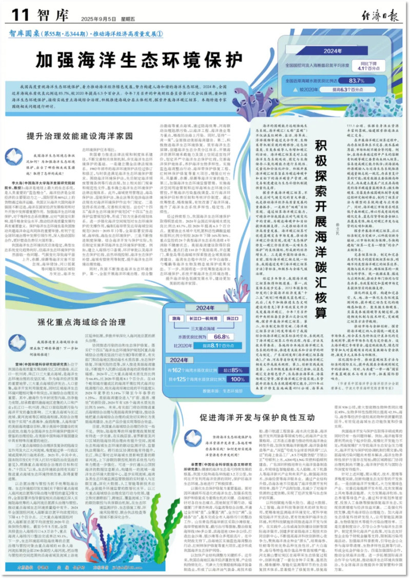 我国高度重视海洋生态环境保护,着力推动海洋经济绿色发展,努力构建人海和谐的海洋生态环境。2024年,全国近岸海域水质优良比例达83.7%,较2020年提高6.3个百分点。今年7月召开的中央财经委员会第六次会议强调,要加强海洋生态环境保护,接续实施重点海域综合治理,积极推进海域分层立体利用,探索开展海洋碳汇核算。本期特邀专家围绕相关问题进行研讨。