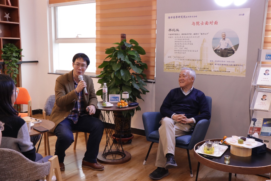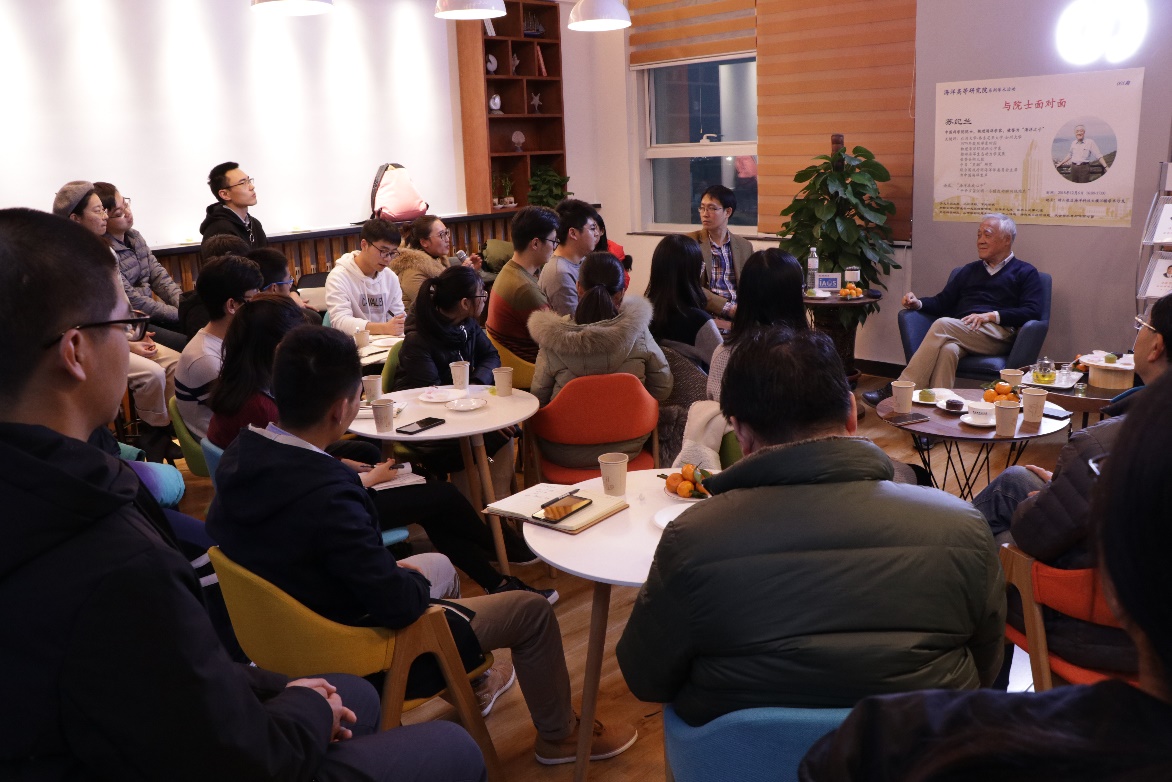 On the afternoon of December 6, the 1st Future Marine Forum: Face to Face with Academicians was held at the academic salon on the 10th floor of the Institute for Advanced Ocean Study(IAOS), Ocean University of China(OUC). This forum is one of the academic activities held by IAOS. Su Jilan, the famous physical marine scientist and academician of Chinese Academy of Sciences, was invited as a guest to share his academic and life experience with over 30 attendees including teachers and students. Associated professor Zhang Zhengguang from the Key Laboratory of Physics and Oceanography, Ministry of Education, was specially invited to preside over the forum.