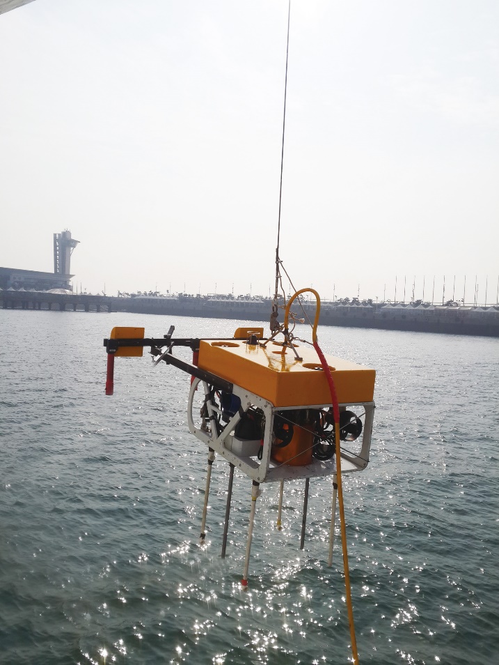 该海底管道检测机器人目前已应用于中海油海底管道电位非接触式检测中,搭载USBL超短基线定位系统、磁梯度传感器、高度计、姿态传感器、深度传感器、高清水下摄像机等传感器,系统自主沿海管行进,通过检测海管电位梯度异常情况判断管道腐蚀点。