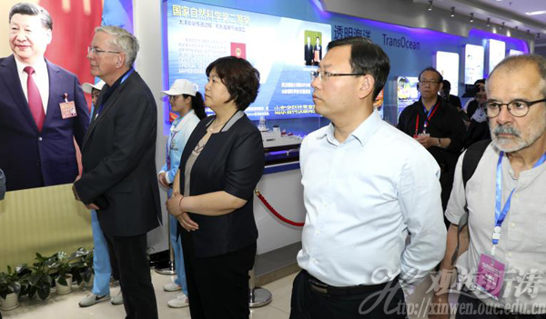 On the morning of May 29, nearly 100 academicians from more than 20 countries attending the 3rd Qingdao International Academicians Forum, as well as represents from 34 well-known domestic and foreign universities, 39 research institutes and 26 well-known enterprises, came to view the Institute for Advanced Ocean Study(IAOS) in Ocean University of China. Song Yongxiang, member of the Standing Committee of Qingdao municipal Party Committee and secretary of political and legal affairs commission, Wang Xijing, secretary of the Licang District Party Committee, and Zhang Youyu, Chief Executive of the Licang District Government, attended this event. Tian Hui, party chief of Ocean University of China, and Zhang Jing, deputy secretary of the party committee, accompanied them to visit.