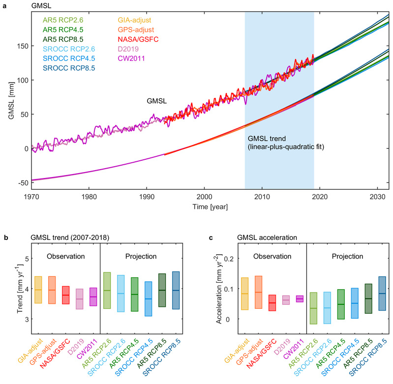 该研究首次评估了IPCC AR5和SROCC报告对未来海平面预估的模拟能力。研究表明,在考虑自然变率和垂直陆地运动后,模式预测在2007-2018年间全球和区域平均海平面上升趋势与实际观测吻合得较好(90%置信区间),上升速度约为3.6-4.1mm yr-1。实际观测的全球平均海平面上升加速度(1993-2018;0.053 ± 0.026 mm yr-2)和验潮站观测的区域加权平均海平面上升加速度(1970-2018;0.063 ± 0.120 mm yr-2)高于RCP2.6(0.035 ± 0.052 mm yr-2)的预测,介于RCP4.5(0.048 ± 0.048 mm yr-2)和RCP8.5(0.067 ± 0.049 mm yr-2)的预测范围之间,但区别并不显著(90%置信区间)。