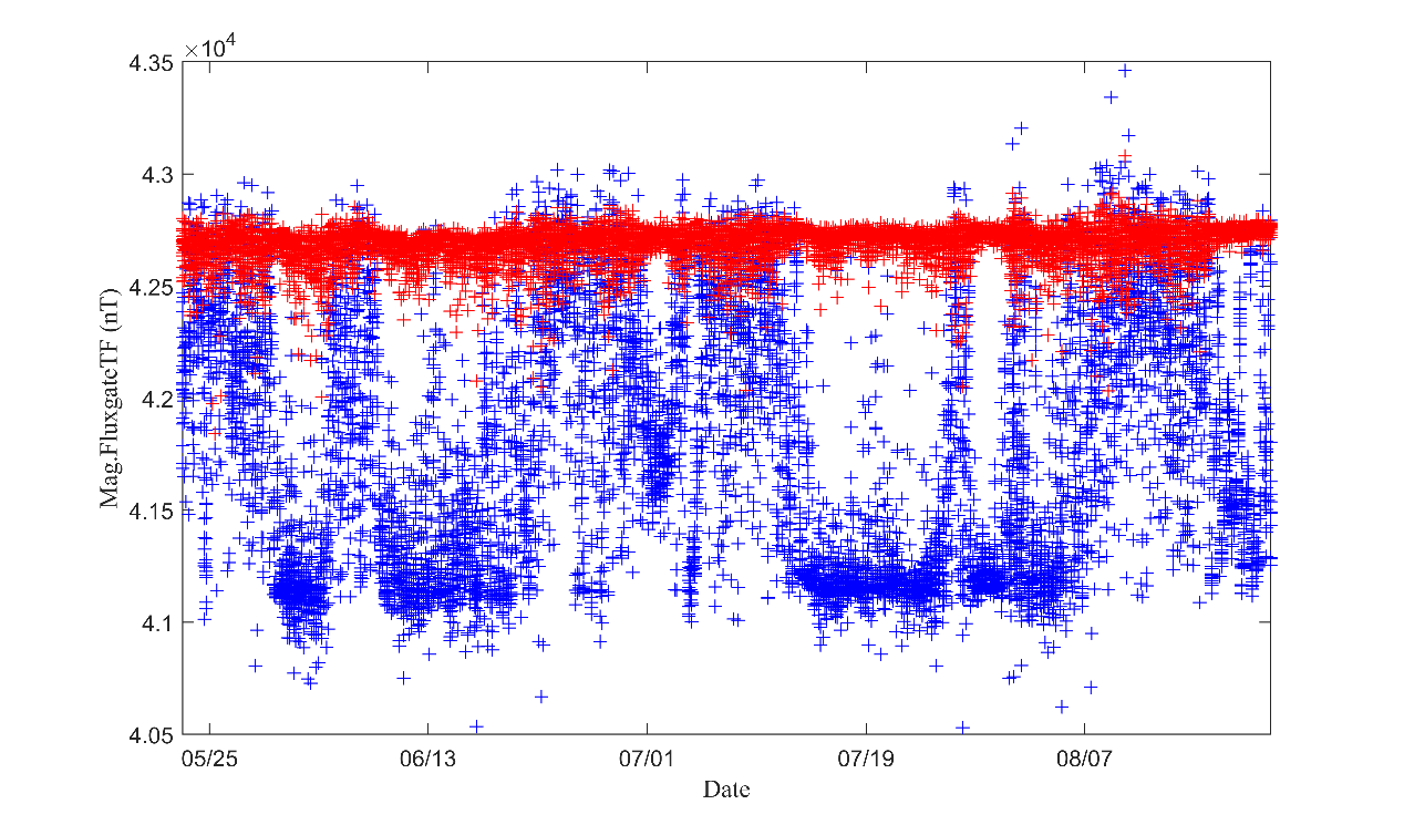 图3 磁测总场强度。(蓝):补偿前;(红):补偿后