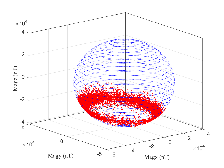 图2 三分量实时磁测轨迹(红)与最佳拟合椭球面(蓝)