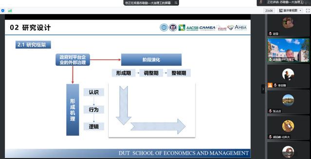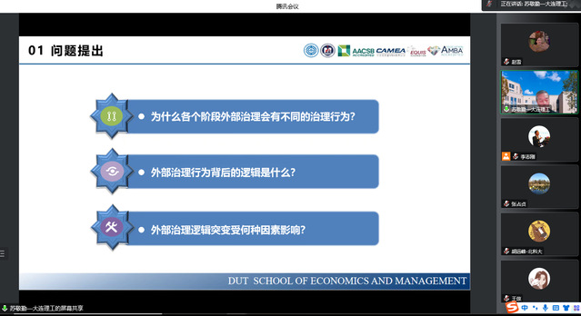 会议伊始,李志刚教授对苏敬勤教授的云端“到来”表示热烈欢迎,并简要介绍了苏教授在案例研究与推广事业中的重要地位,进而对其带来“为什么平台外部治理的逻辑会发生变化?”的前沿理论分享表示衷心感谢。苏教授就五个方面展开讲解,分别为问题提出、研究设计、研究发现、深度讨论和实践启发。