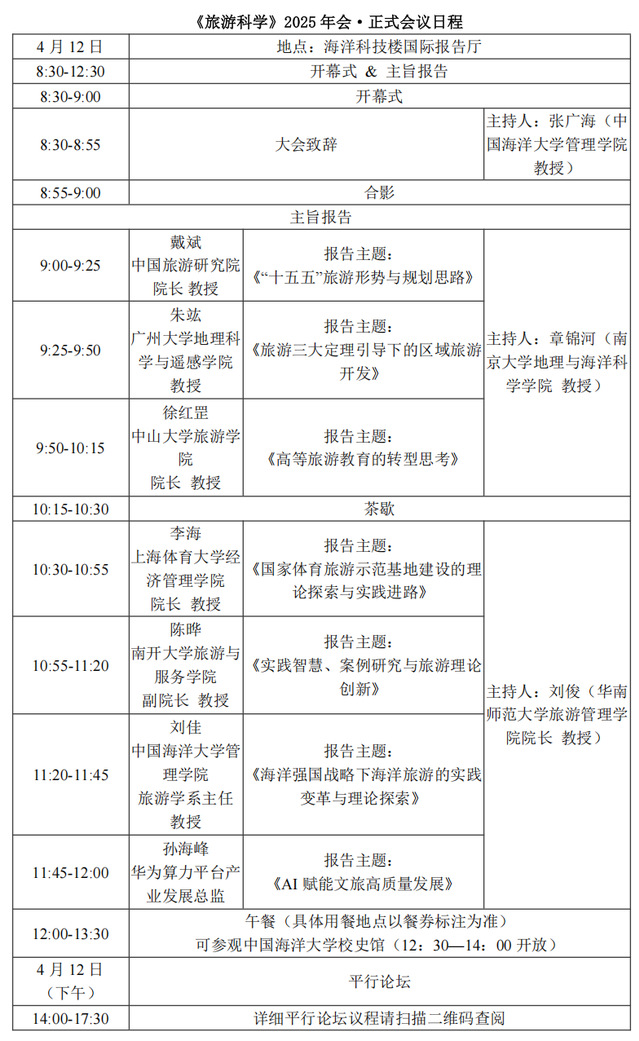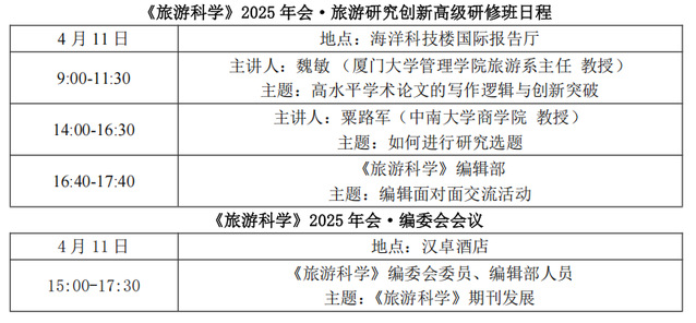 会议时间:2025年4月10、11日报到(周四、周五),4月11日旅游研究创新高级研修班(周五),4月12-13日正式会议(周六、周日)。