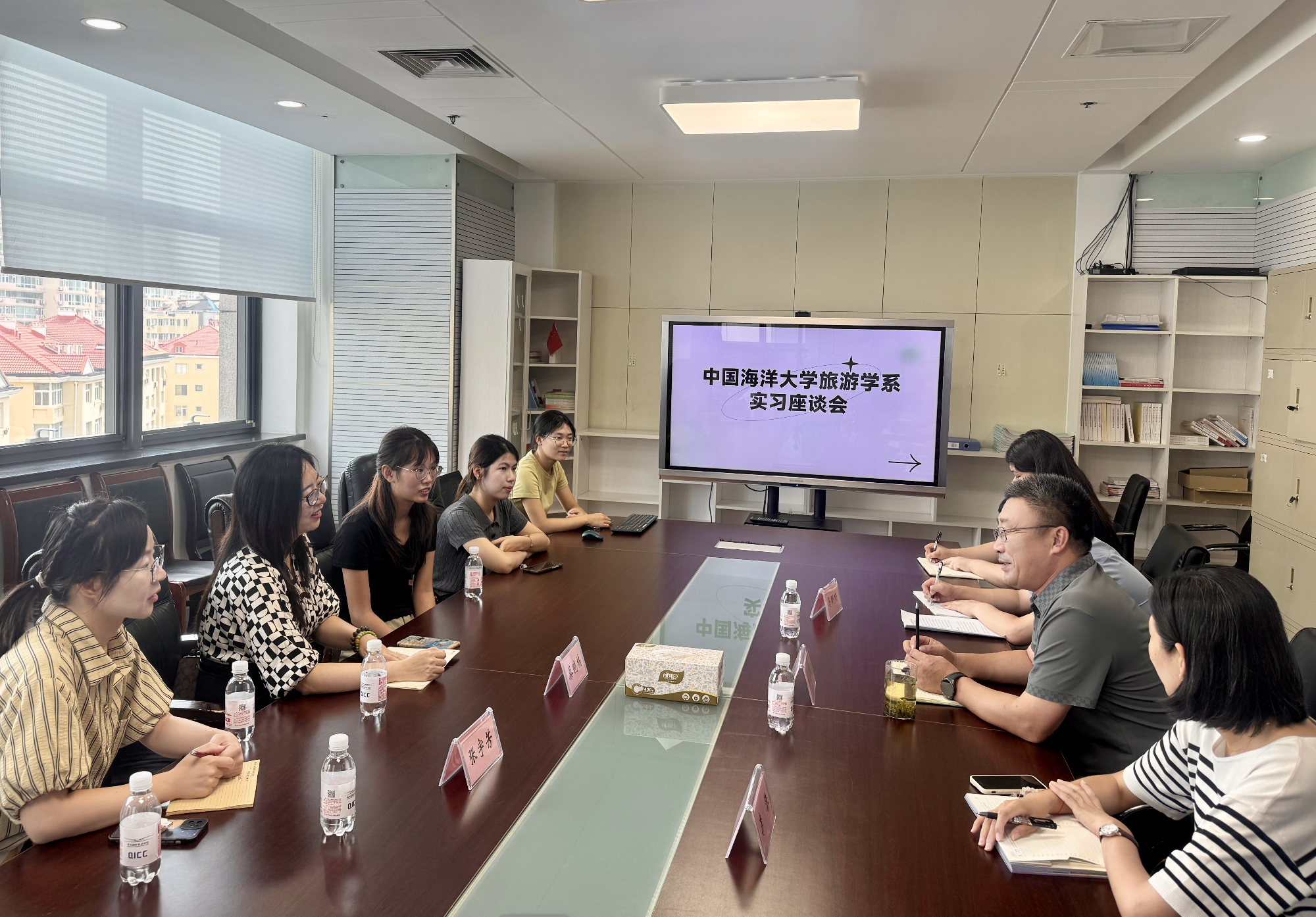 韩津民总经理首先表达了深化校企合作的强烈意愿,并提出持续合作的具体路径。他特别强调:“通过双方深度沟通,依托前沿旅游管理理论破解企业运营中的实际难题,实现理论引领实践、实践反哺理论的良性循环,最终达成互利共赢。”随后,他介绍了企业近期的运营成果与发展战略,并进一步与老师们围绕企业经营、产品结构、人才需求等多方面展开讨论,在旅游专业协同育人及长效合作机制方面形成多项共识,未来将拓展至本科生实习、研究生参与和教师科研合作等多维模式。实习工作负责人则就岗位职责安排作了说明,并特别赞扬实习生们的工作表现,指出:“在集团旅游旺季的关键时期,实习生发挥了重要作用。”