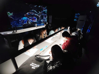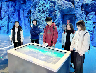 步入场馆,浓郁的海洋科技氛围扑面而来。团队成员自由穿行于各展区之间,变被动接受为主动探索:从亲手操作摇杆学习海洋生物知识,到挥手触发屏幕动画了解洋流形成原理,再到调试实验器材探索海洋科学奥秘。团队成员认真记录每一处体验细节,既关注互动环节如何激发探索欲,也思考知识传递的高效路径。