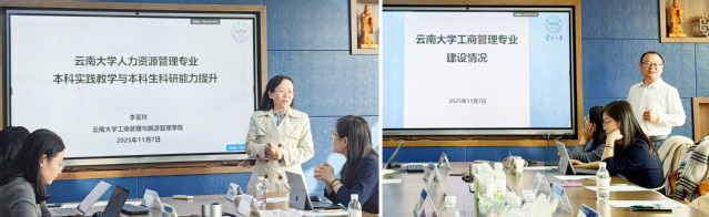 随后,陶小龙主任详细介绍了云南大学工商管理专业的发展历程、建设成果与办学特色,并分享了在国家级教学成果奖申报、教学竞赛组织与课程建设等方面的经验举措。李亚玲教授以“本科生实践教学与科研能力提升”为主题,重点介绍了云南大学在本硕博贯通培养、科研项目引领及成果产出等方面的探索实践,展示了以科研促教学、以实践强能力的育人特色。