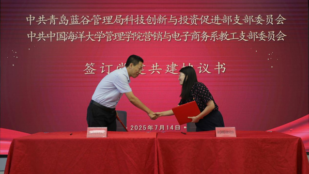 金天宇表示,学院以红色铸魂为原点,以蓝色拔尖人才培养为引擎,正在加快构建新商科“守正创新”的知行体系。青岛蓝谷是助推海洋强国建设的战略承载区,双方此次共建,既是深入贯彻新时代党的建设总要求,深化“一融双高”建设的重要举措,又是深化校地协同创新的重要实践。双方将以党建为引领,以科研为核心,围绕学院的研究方向和蓝谷的实际需求,加强在人才培养、科研转化、社会实践等领域的协同创新,推动教学、科研、人才培养与地方产业需求的精准对接。