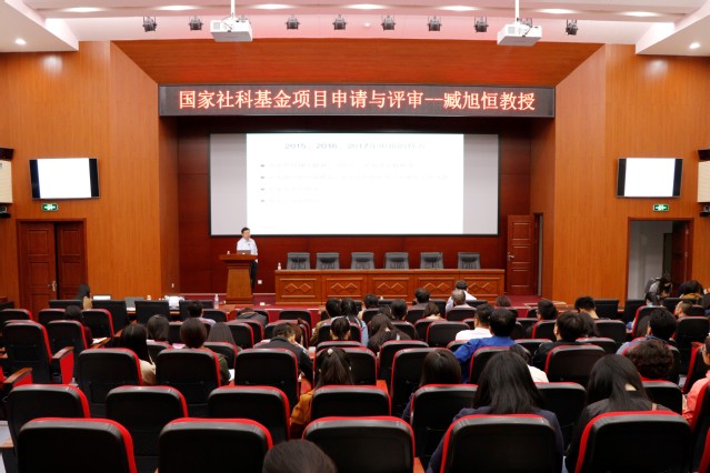 臧旭恒教授根据参与国家社科基金会评的多年经验,从国家社科基金的评审情况、申报国家社科基金的基本原则、项目选题、注意事项四方面传授经验建议。首先,臧旭恒教授详细介绍了2015至2017年国家社科基金的申报、入围情况,指出近年国家社科基金具有申报者水平提高、青年人申报踊跃、自选题与指南课题趋于一视同仁的特点,鼓励在场教师、特别是青年教师认真学习领会十九大精神,积极参与。接着,臧旭恒教授根据国家社科基金申报的基本原则提出立项建议,建议以正确政治方向和较高学术水准为立项导向,以重大现实问题为主攻方向;建议以十九大和习总书记一系列重要讲话精神为立项重点。随后,臧旭恒教授就《国家社科基金项目课题指南》中的范围性条目、具体条目及自选题目分别做出讲解,指出只要符合《课题指南》的指导思想和基本要求,各学科均鼓励申请人根据研究兴趣和学术积累申报自选课题。在选题上,臧旭恒教授提出开拓性、先进性、成果必要性和成果可能性的原则。最后,臧旭恒教授提醒学者申请时注意认真阅读当年申报指南,关注指南中各类项目研究时间要求、资助力度;跨学科研究课题要遵循“靠近优先”的原则,选择一个为主学科申报。