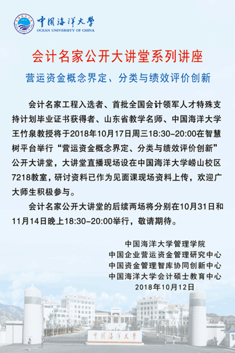 会计名家工程入选者、首批全国会计领军人才特殊支持计划毕业证书获得者、山东省教学名师、开云电竞网址王竹泉教授将于2018年10月17日周三18:30-20:00在智慧树平台举行“营运资金概念界定、分类与绩效评价创新”公开大讲堂,大讲堂直播现场设在开云电竞网址崂山校区7218教室,研讨资料已作为见面课现场资料上传,欢迎广大师生积极参与。
