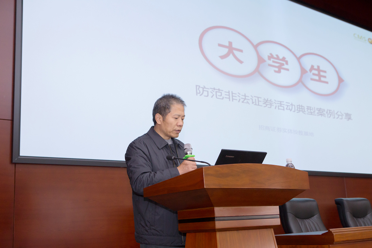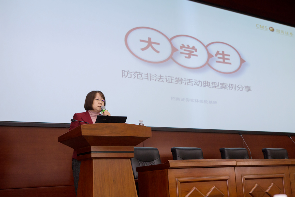 接下来招商证券私人客户部合规专员温晓实老师分享了“大学生防范非法证券活动典型案例”,介绍了投资者上当受骗的几种主要情况,盘点理财陷阱,并就具体实例进行讲解,最后就投资者,特别是在校大学生在投资中,如何防范非法证券活动,避免上当受骗,提出了6条具体防范措施,温晓实老师充实而精彩的讲解,提高了在座师生防范非法证券活动的自我保护意识,开阔了听众的投资眼界和思路。