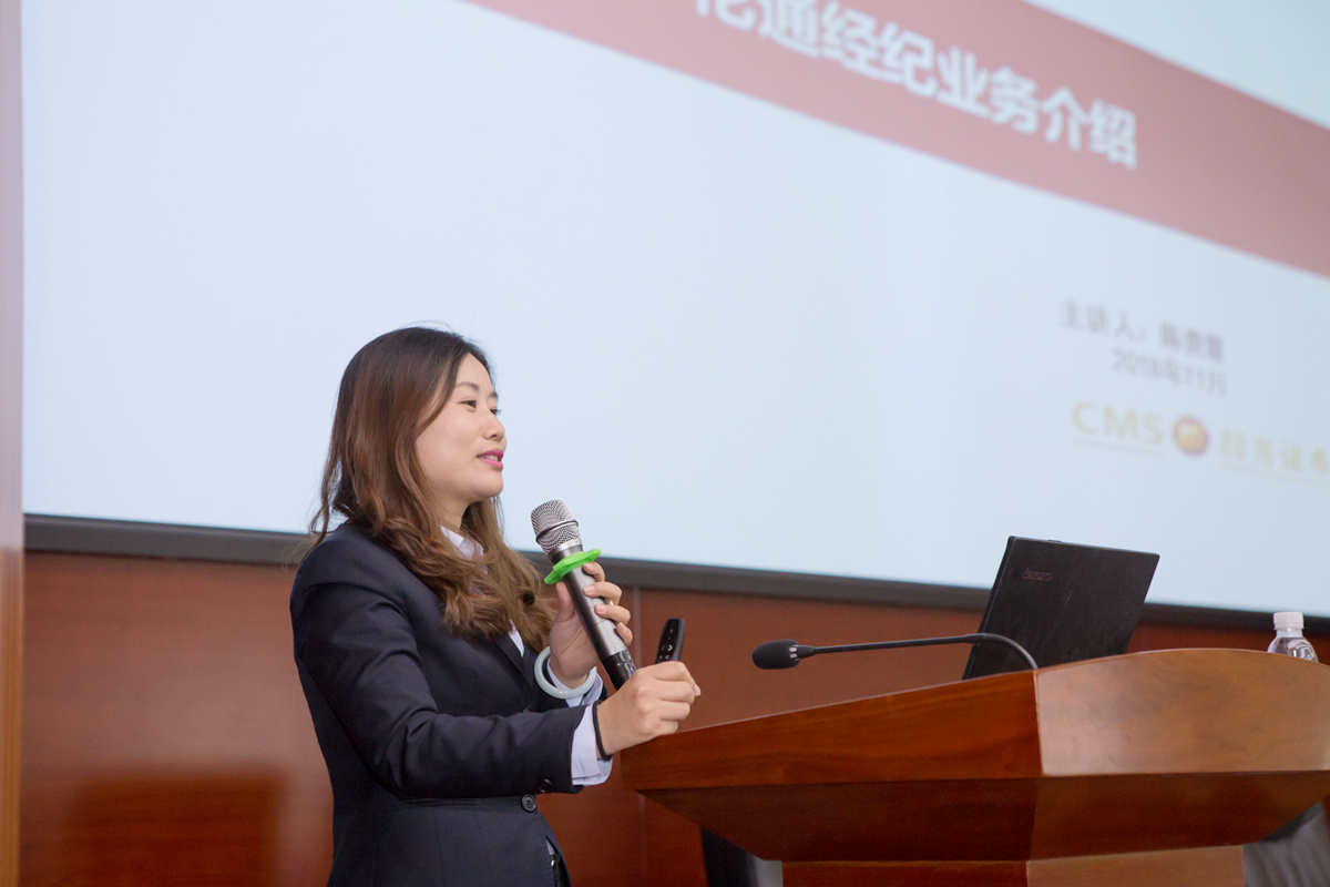紧接着招商证券青岛分公司财富顾问陈贵霞详细讲解了上海证交所和伦敦股票交易市场的互联互通的证券新生渠道—“沪伦通”,同时陈贵霞顾问作为海大校友,与现场的师弟师妹进行了亲切交流。
