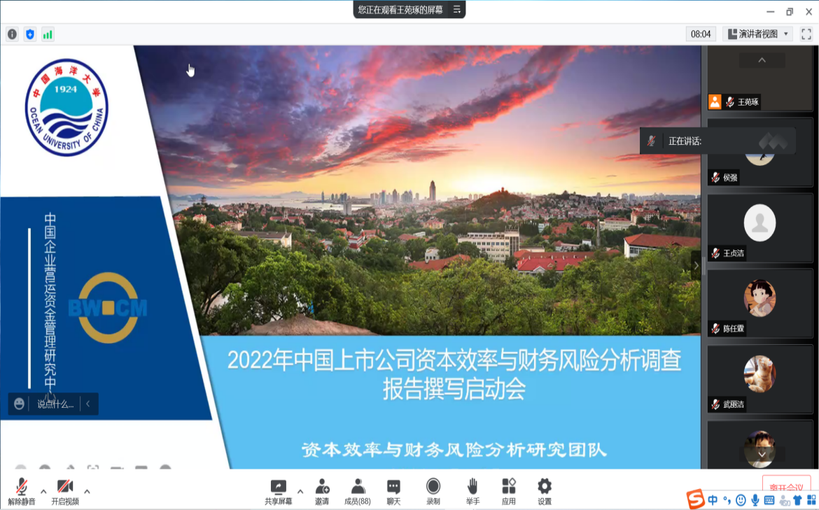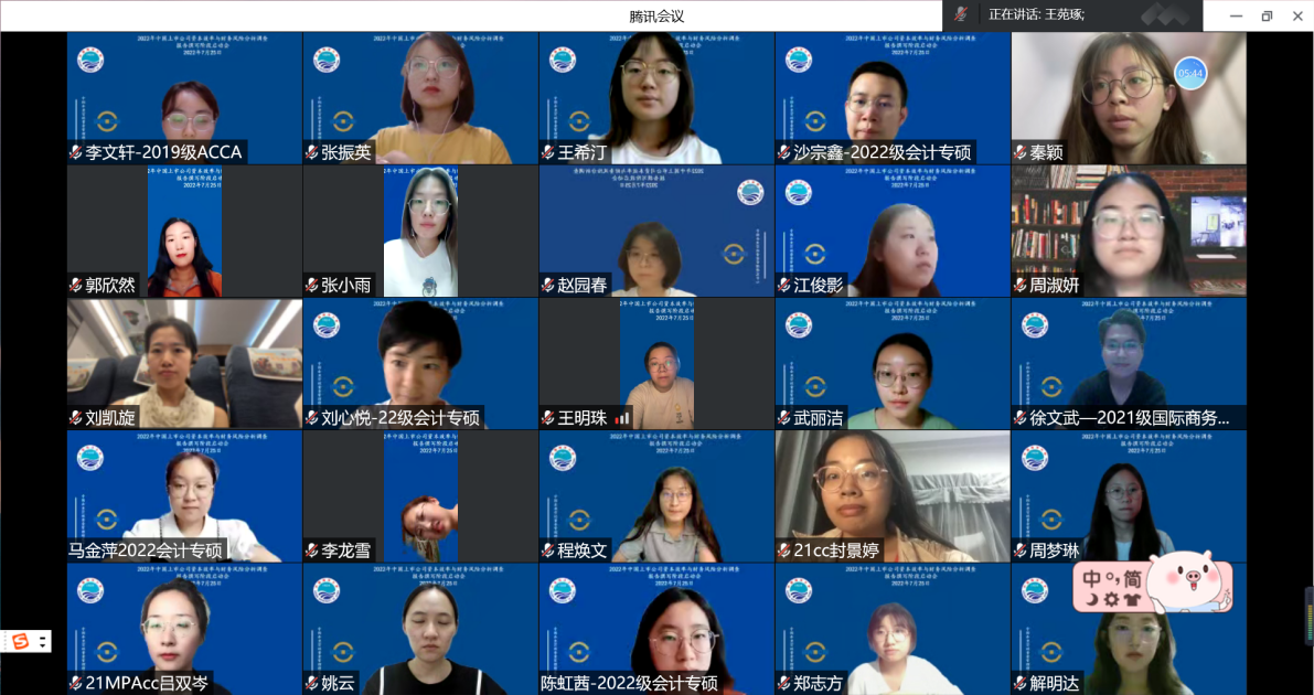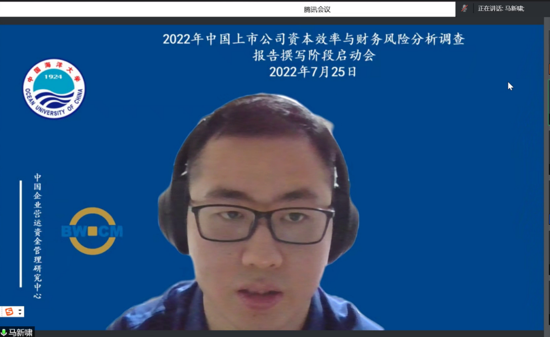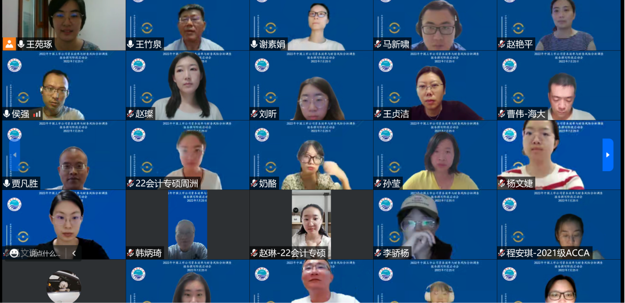 2022年7月25日晚7点,由中国企业营运资金管理研究中心举办的“2022中国上市公司资本效率与财务风险调查报告撰写启动会”通过腾讯会议方式在线上召开。王竹泉教授、王贞洁教授、贾凡胜教授、谢素娟教授、赵艳平教授、王苑琢副教授、孙莹副教授、程六兵副教授、杜媛副教授、曹伟副教授、赵璨副教授、彭涛副教授、马新啸副教授、刘昕老师等研究团队教师以及90余名博士生、硕士生、本科生参加会议。