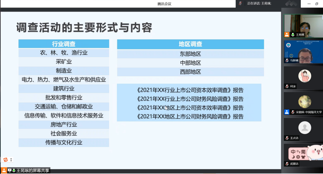 接下来,王苑琢副教授对2022年中国上市公司资本效率与财务风险调查报告撰写阶段的具体安排进行了详细介绍。王苑琢副教授指出,本次调查活动主要以行业调查、地区调查、专题调研、案例调研、文献调研等形式展开,并对行业调查和地区调查过程中所涉及的资本效率调查报告和财务风险调查报告的框架结构、分析指标等内容进行了全面的介绍。随后,王苑琢副教授对调查的步骤、报告撰写工具包、相关学习资源以及报告撰写分工与时间安排进行了详细的讲解,为同学们高质量完成调查报告撰写工作提供了有力支撑。