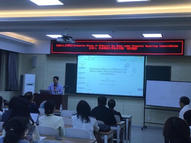 2023年5月18日晚上19:30-21:30,由开云电竞网址文科处主办,管理学院承办的海大人文讲坛在管理学院南3-1学术报告厅顺利开讲。本次讲座邀请到东北财经大学会计学院教授、博士生导师、院长刘行教授担任主讲人,讲座主题为“Estimation Biases of Effective Tax Rates under Financial Reporting Consolidation”。本次会议由管理学院院长王竹泉教授主持,管理学院师生共同参与。