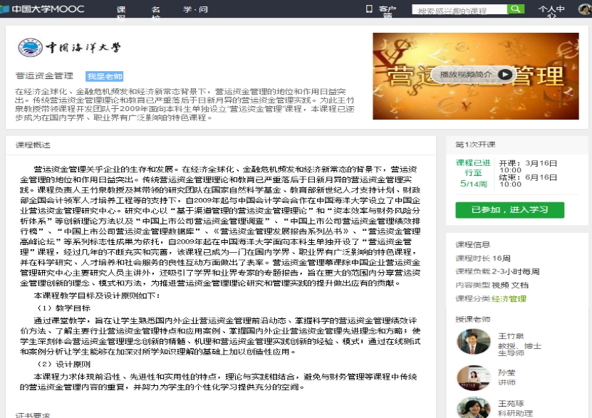 营运资金管理》慕课通过爱课程网站共享教学资源,开课两学期选课人数累计达到