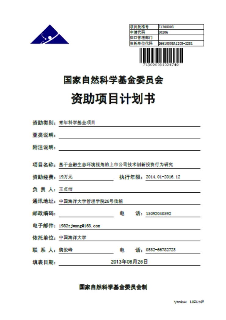 国家自然科学基金青年项目:基于金融生态环境视角的上市公司技术创新投资行为研究(