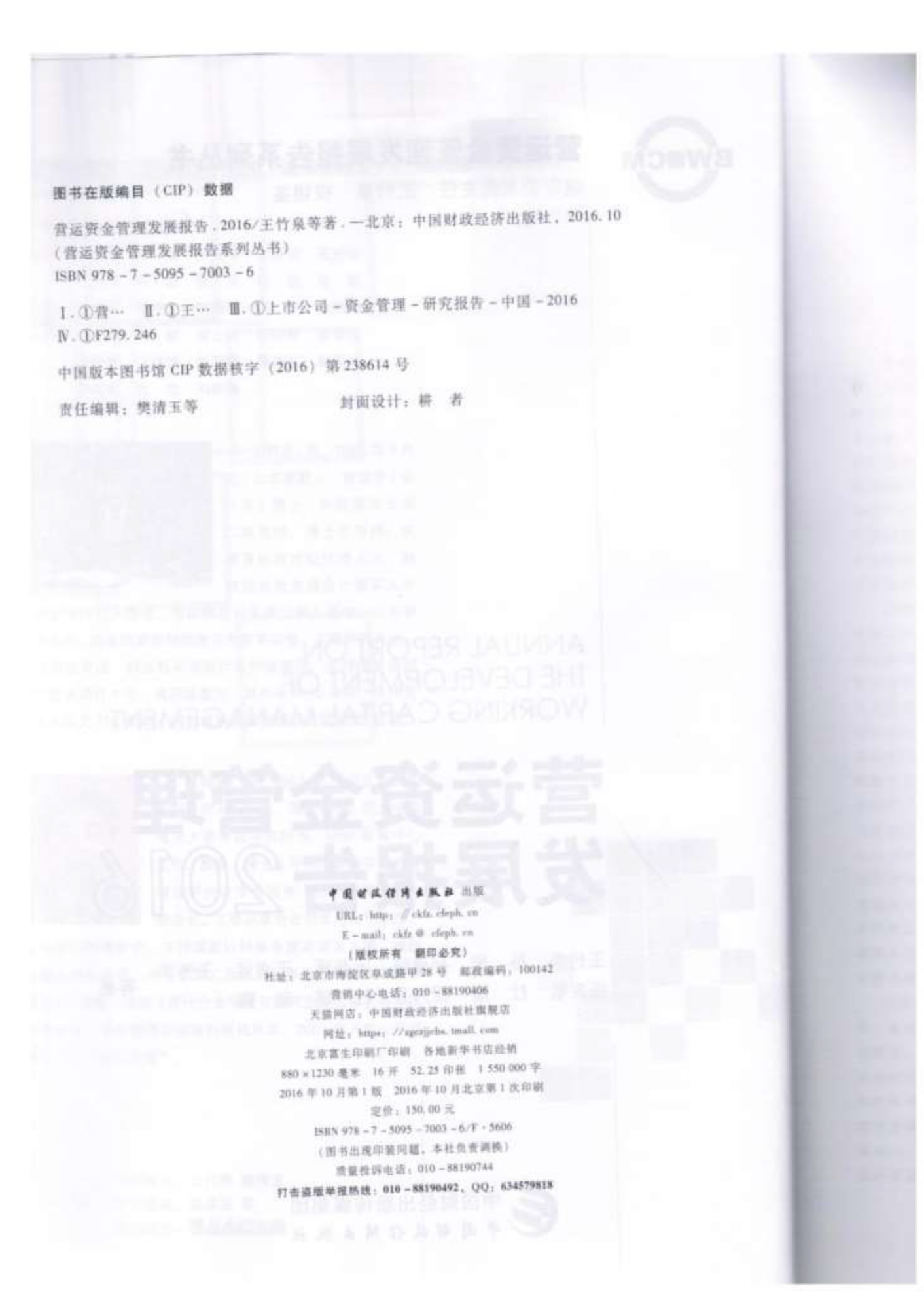 王竹泉、孙莹、孙建强等,《营运资金管理发展报告2016》,封底