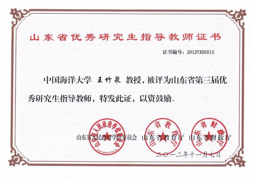 王竹泉教授被评为山东省优秀研究生导师(2012年)