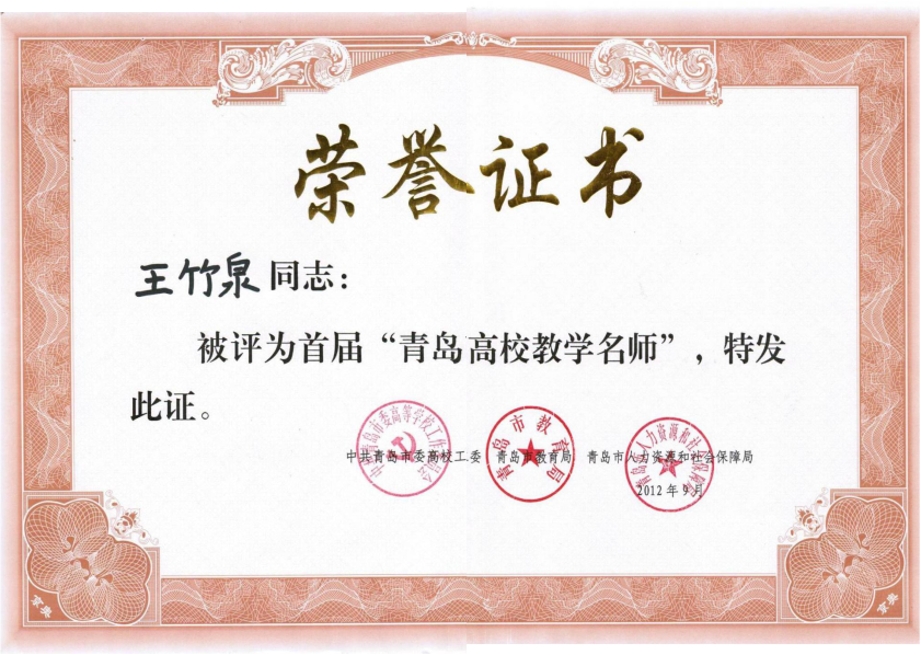 王竹泉教授被评为首届青岛高校名师(2012年)